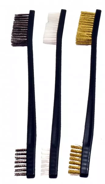 3-delat Utility Brush Set som innehåller tre dubbeländade borstar: en stålborste, en kopparborste och en nylonborste.